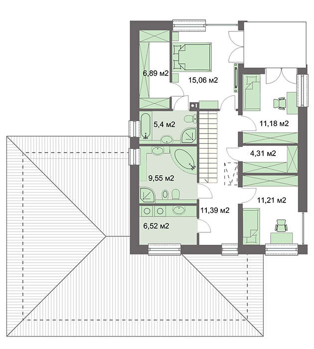 Предусмотрено четыре спальных помещения. Апартаменты первого этажа отлично подойдут как место отдыха старшего поколения семьи. Они обособлены, включают санузел, помещение для гардероба и собственную террасу. Спальни второго этажа порадуют разнообразием формы и размеров. Наибольший комфорт достигнут в комнате хозяев за счет включения в площадь апартаментов санузла, гардероба и балкона.