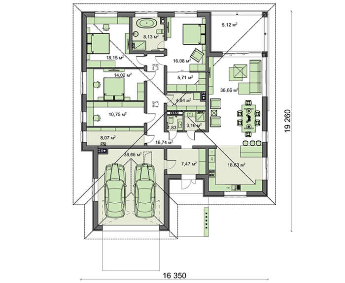 Проект содержит три раздела – АрхитектурныйКонструктивный и Инженерный: водоснабжение, отопление, вентиляция, канализация, электроснабжение (приобретается за дополнительную плату) + Пояснительная записка.
