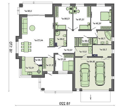 Встроенный гараж площадью почти в 40 квадратов легко разместит два автомобиля. Примыкающее помещение рекомендуется использовать как мастерскую. Дом рассчитан на проживание средней по величине семьи. Четыре спальни имеют почти одинаковые размеры. Гостиная получена при соединении места отдыха, приготовления и приема пищи в одно помещение. В проекте предусмотрены небольшие гардеробные, кладовки и два санузла для создания комфортных жизненных условий.