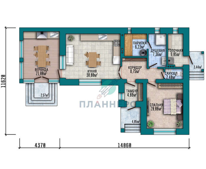 Особого внимания заслуживает гостиная в 38 кв. м, объединившая зону отдыха, столовую, кухню, граничащая с закрытой верандой. Здесь достаточно места для приема больших компаний. Развлечения не заканчиваются парными процедурами и чаепитием. Стационарный мангал на веранде поможет приготовить вкуснейшие шашлыки и жаренные на углях овощи.