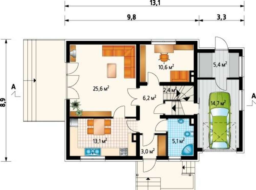 Присутствие разных по назначению помещений на первом этаже дает пространству универсальную направленность. Расположенный в масштабах уровня гараж рассчитан на хранение в просторных условиях одного авто и имеет место для мастерской, в которой собран инструмент и приспособления. Это помогает в комфортных условиях выполнять слесарные работы.