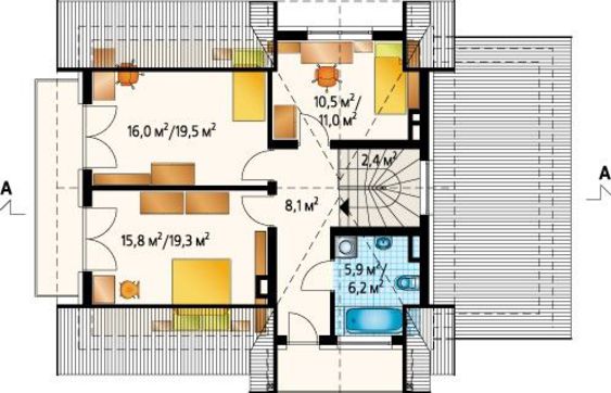 К особенностям планировки относится соединение кухни со столовой в одно помещение. Такой прием упрощает хозяйский труд. Для отдыха и личных дел имеются четыре индивидуальных горницы. Размещение их на разных этажах и отличающиеся габариты светелок позволяют каждому члену семьи найти самый лучший для себя вариант. Особенность комнат верхнего уровня в наличие балконов. Их компактные и вместительные габариты рассчитаны на размещение небольшой по размерам мебели и комфортное проведение времени.