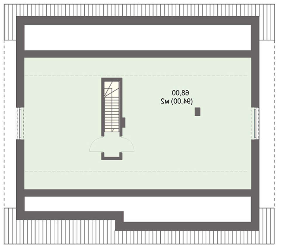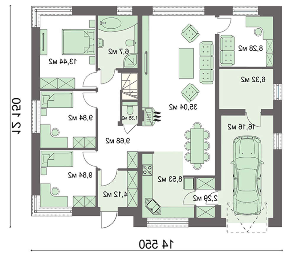 Пространство строго разделено на зоны. Гаражное помещение отнесено в угловую часть, габариты позволяют разместить одну единицу транспорта. Среднюю часть занимает зона для приема гостей. Она получена за счет слияния трех комнат: гостиной, кухни и столовой. В центре расположен камин — символ домашнего очага и дополнительный источник тепла. Для деловых встреч и переговоров отведено специальное помещение — кабинет. Тихая атмосфера способствует заключению в экономическом плане выгодных договоров.
