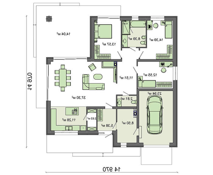 Внутренне пространство коттеджа условно можно разделить на три блока: технический, спальный и гостиный. Первая зона включает гараж, санузел и подсобное помещение топочной. В ней можно организовать домашнюю мастерскую или использовать под иные функции, в зависимости от предпочтений жильцов.