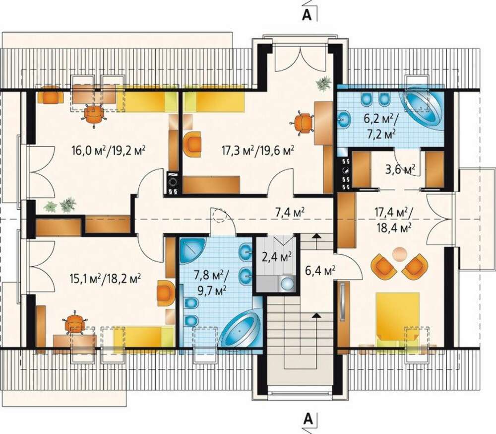 Для полноценно труда и крепкого здоровья потребуется отдых, высокое качество которого гарантирует пять индивидуальных помещений. Расположенное на первом этаже отлично подходит как кабинет, комната дружеского общения, спальня старшего поколения. Четверо апартаментов второго этажа дают возможность своих хозяевам много времени проводить на свежем воздухе, за счет имеющегося балконного пространства. Наделенная особыми почестями хозяйская спальня отличается от иных комнат просторным гардеробом и своими санитарными покоями.