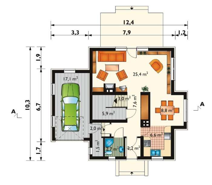 Выделение на первом этаже места под гараж поможет решить проблему размещения автомобиля и мастерской для его обслуживания.