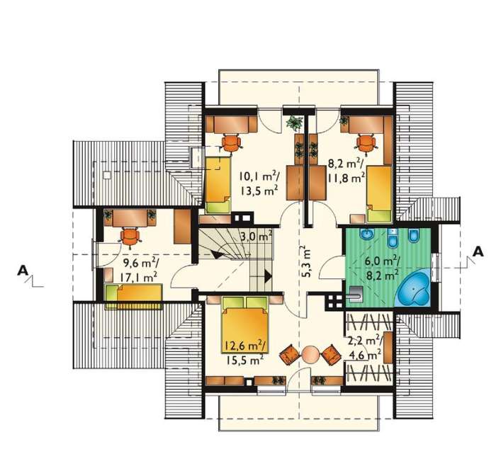 Верхний уровень для своих хозяев приготовил четыре компактных спальных помещения, различающихся планировкой и габаритами. Но это не мешает в каждое поместить всю требуемую для комфорта мебель. Три спальни выгодно отличаются уютными балконами, которые особенно востребованы среди романтиков и мечтателей.