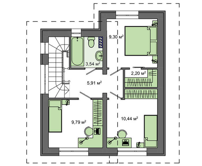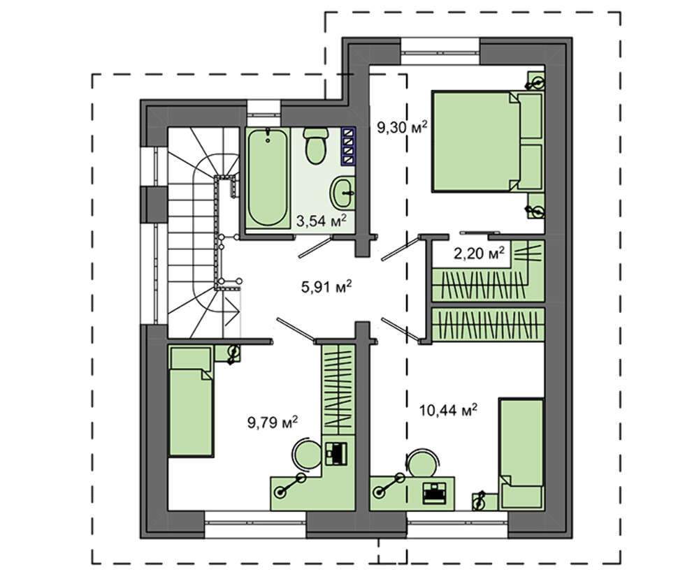 Внутреннее пространство рационально поделено между помещениями. Значительная часть площади отводится под жилые комнаты. Это три личные спальни разной комфортности на втором этаже и гостиная на первом. В зале принято отдыхать в семейном кругу, встречать гостей или проводить деловые переговоры.