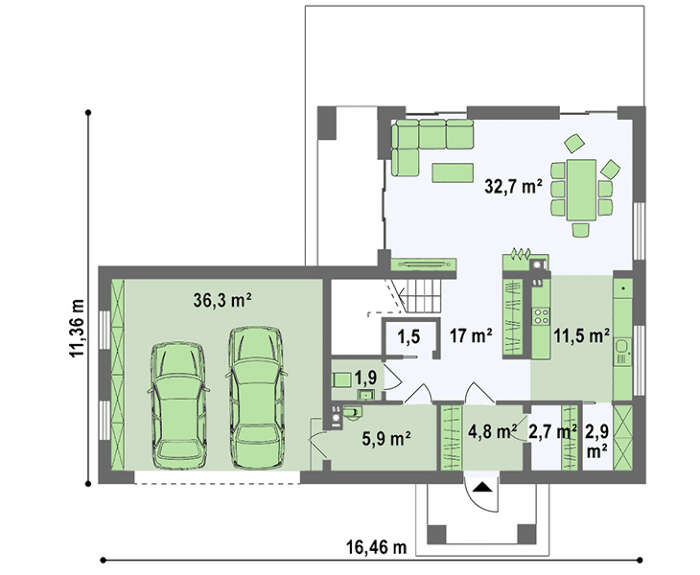 Гордость хозяина-автолюбителя — просторный гараж. Разместив под его кровом два авто можно не волноваться о сохранности автомобиля. Небольшая автомастерская поможет с комфортом обслуживать технику и выполнять мелкие слесарные работы.