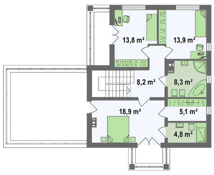 При распределении внутреннего пространства основное внимание уделено созданию комфорта для личной жизни. Индивидуальные апартаменты расположены на втором этаже, надежно отдалены от общих, наполненных смехом и шумом комнат. Их особенность в просторной веранде и балконах, доступ на которые открыт из спален.