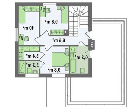 Личные апартаменты расположены на втором этаже. Три помещения несмотря на небольшие размеры рассчитаны на спальные гарнитуры. Особо стоит отметить комнату хозяина. Включение в ее объемы санузла и личного гардероба понравится самому требовательному домовладельцу.