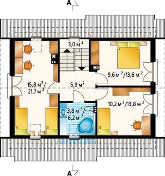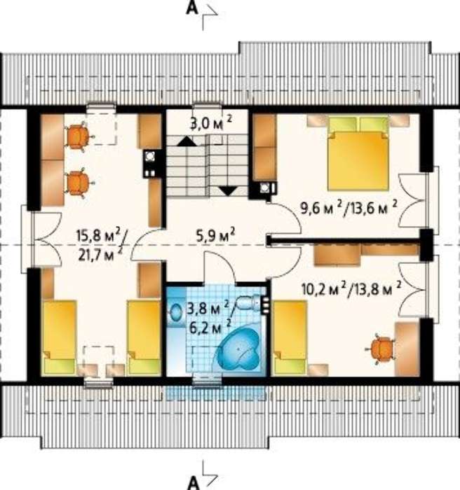 Жилой территории отведен мансардный этаж. Тут расположились отдельные спальни для всех членов семьи. Каждая комната имеет балкон.