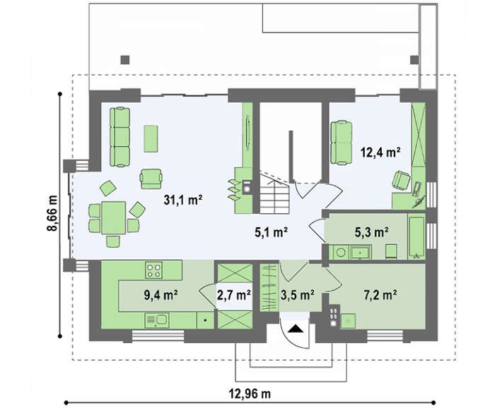 Проект содержит три раздела – Архитектурный, Конструктивный и Инженерный: водоснабжение, отопление, вентиляция, канализация, электроснабжение (приобретается за дополнительную плату) + Пояснительная записка.