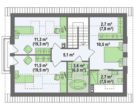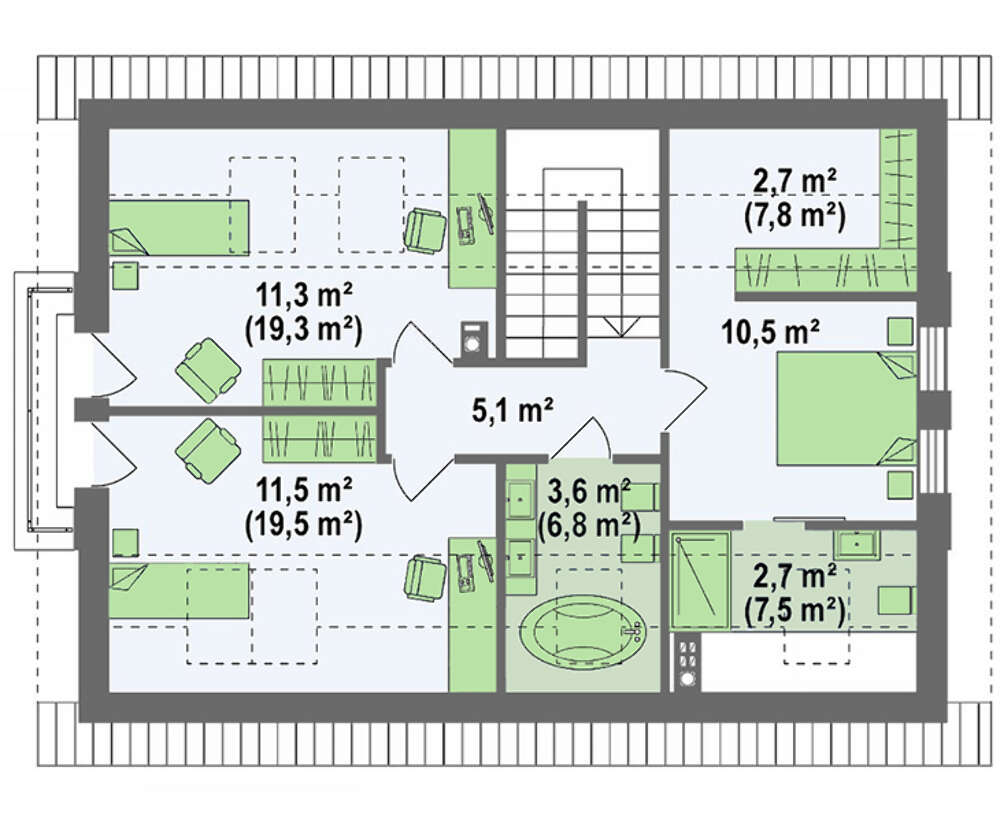 Жилая комната на нижнем уровне может быть использована в качестве личного кабинета хозяина, спальни для членов семьи старшего поколения или комнаты отдыха для гостей. Остальная площадь отдана под территорию сна. Здесь расположены апартаменты владельца дома с личным санузлом и собственным гардеробом. Остальное пространство уровня разделено между двумя спальнями одинаковой площади и уровня комфортности с общим санузлом.