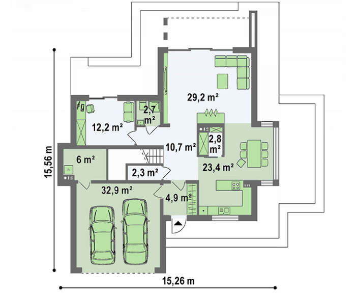 Дополнительные удобства создает гараж. Он сравнительно просторный, рассчитан на два автомобиля, имеет комнату для хранения инструмента и успешного выполнения мелких слесарных работ.