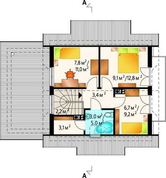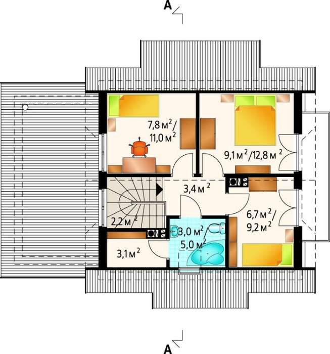 Все пространство второго этажа рассчитано на спальные помещения. Несмотря на небольшие размеры строения, их предусмотрено три, квадратная форма, как наиболее компактная, позволяет поместить все необходимые детали интерьера. Высоко оценено подрастающим поколением будет балконное пространство, доступ на которое открыт из двух спальных помещений. Такое преимущество дает человеку возможность в любое время получить доступ к свежему воздуху и наслаждаться красотою, созданной природою.