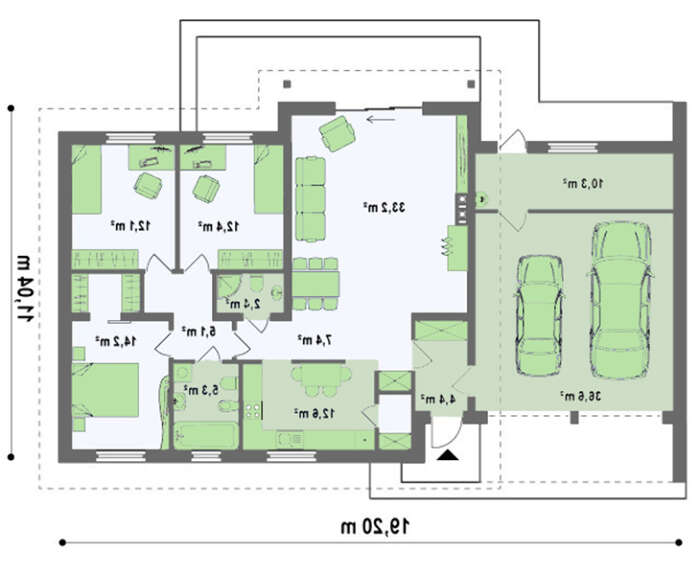 Проект одноэтажного дома с гаражом на две машины в боковой части | Компания Дом4м Россия | ДОМ4М РФ