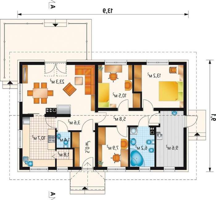 Красивый одноэтажный коттедж в традициях современной Европы не просто впишется в пейзаж, а станет украшением усадьбы практически любых размеров. Габариты дома позволяют поместить его даже на стандартном наделе в 6 соток. Но по наружной компактности трудно судить о внутренней площади. Здесь есть все помещения, необходимые для проживания среднестатистической семьи. Проект может быть использован как для строительства полноценного дома, так и сезонной дачи.
