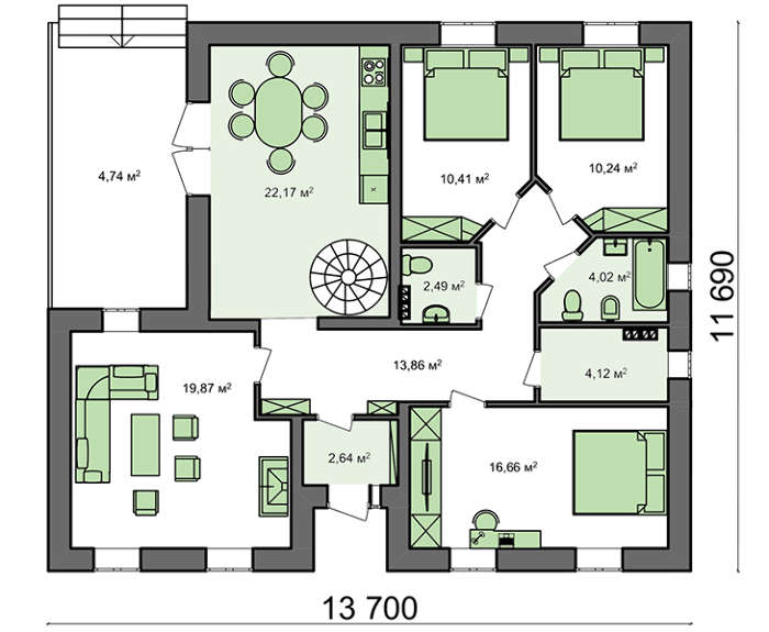 Проект содержит три раздела – АрхитектурныйКонструктивный и Инженерный: водоснабжение, отопление, вентиляция, канализация, электроснабжение (приобретается за дополнительную плату) + Пояснительная записка.