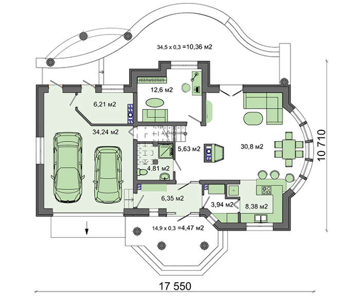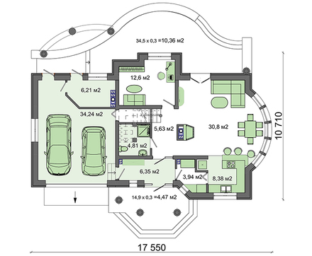 Благодаря разумному разделению площадей внутреннее пространство включает все помещения, необходимые для комфортного проживания дружественно настроенной семьи. Емкий гараж рассчитан на два автомобиля. Небольшая, специально выделенная площадь вместит весь требуемый для работ по хозяйству инструмент и приспособления.