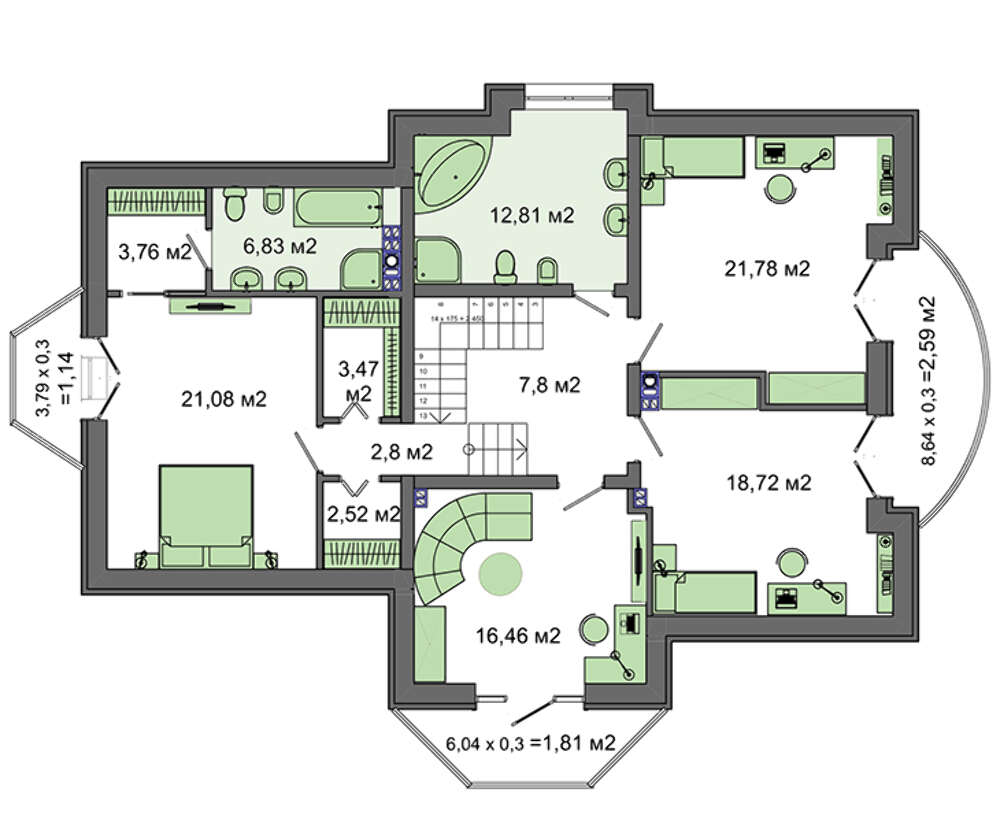 Среди помещений второго уровня отдельно выделены хозяйские апартаменты. Включение в их габариты гардеробного и санитарного помещения создает необычную атмосферу комфорта и свободы.
