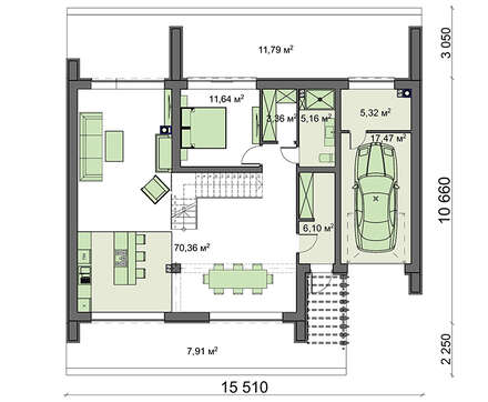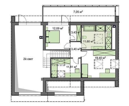 Жилая комната может быть использована для размещения гостей или переоборудована под личный кабинет. Здесь же находятся технические помещения: гараж для авто и топочная. Верхний уровень - это территория сна. Она включает две спальни, ванную комнату и апартаменты хозяина с собственным гардеробом.