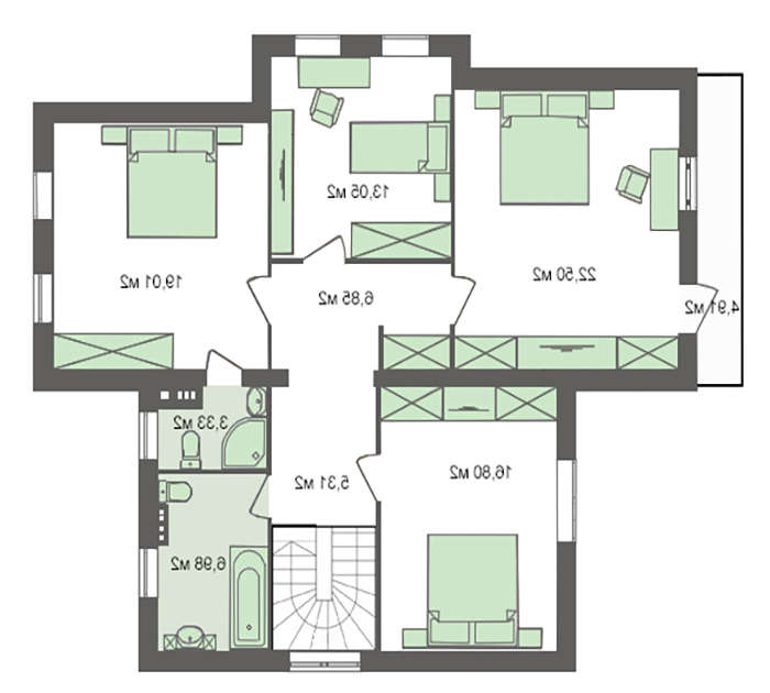 Второй уровень – четыре комфортабельные спальни. Их разница в площади и планировке, наибольшие апартаменты выгодно отличаются просторным балконом.