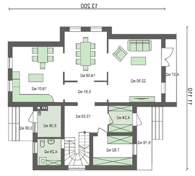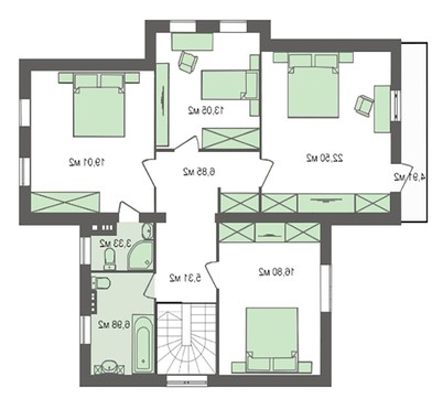 Помещение гостиной способно вместить большую компанию, места достаточно для торжественных встреч и пышных юбилеев. Зоны отдыха и приготовления пищи максимально раздвинуты, планировка препятствует попаданию запахов снеди в гостиную зону. К дополнительным помещениям первого этажа относится санузел и два просторных гардероба. Веранды позволяют личное время проводить на свежем воздухе, среди красивой растительности слушать соловьиные трели.