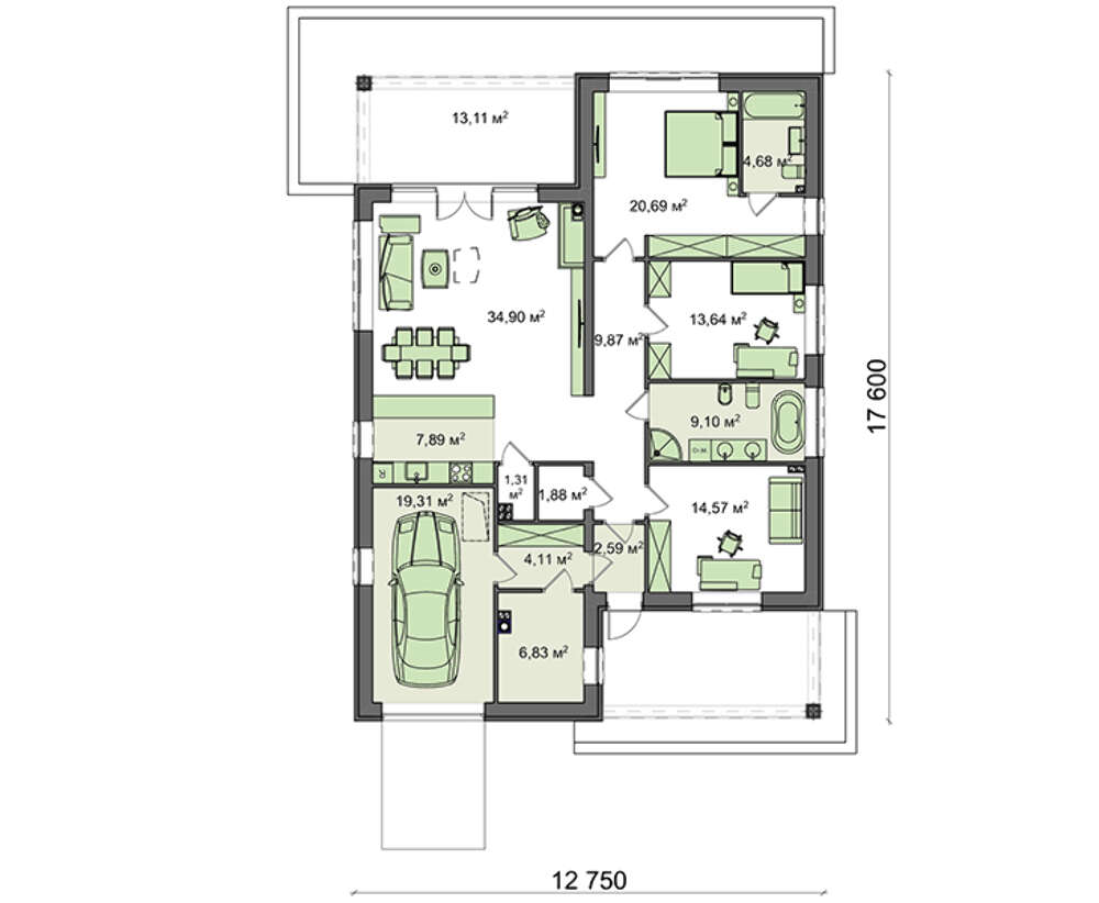 Жилой блок включает три спальни разной площади и просторный санузел. Технические помещения представлены гаражом для хранения автомобиля, раздевалкой и котельной, которую дополнительно можно использовать как мастерскую или кладовую.