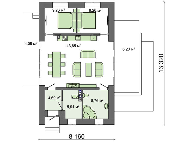 План одноэтажного жилого дома с 2 личными комнатами 4M619