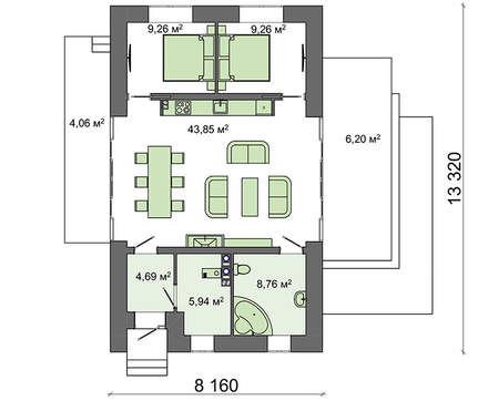 Как и положено для данного стиля, внутреннее пространство легко и просто разделено на комнаты. Большую часть занимает гостиная. В ней имеется два выхода на террасы, расположенные на противоположных сторонах света. За счет слияния со столовой и кухней достигнута большая площадь в 43 квадрата. Личных помещений два, они небольшие и компактные, позволят разместить только необходимую мебель. Предполагается, что большую часть времени хозяева будут проводить на общей территории.