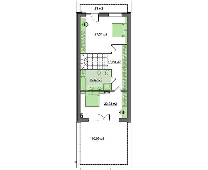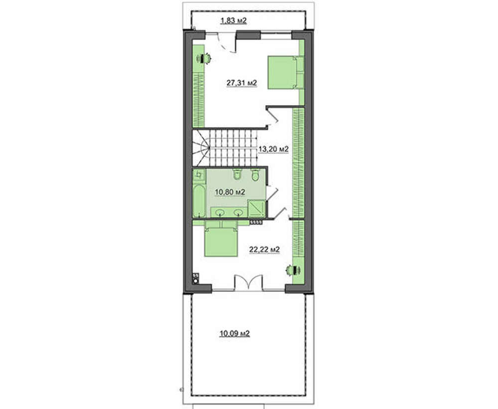 Второй этаж включает две спальни. Они разнесены в разные части уровня, это позволит жильцам поддерживать приватность личной жизни. Каждая из комнат имеет выход на террасу или балкон.