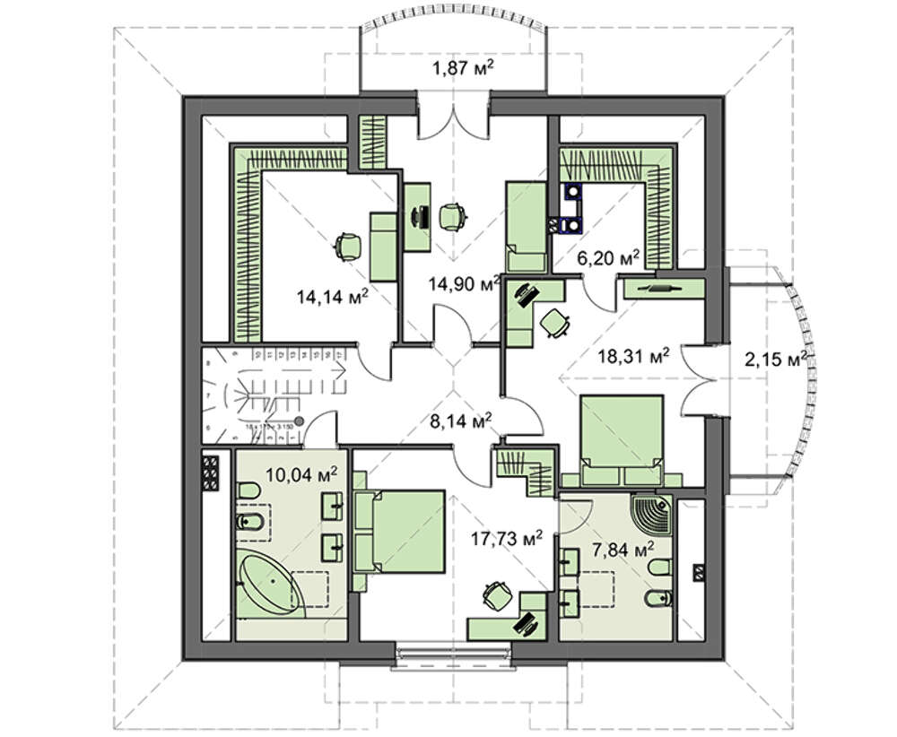 • 4M1472 План стильного дома в три этажа площадью 316 кв. м с полукруглыми балконами