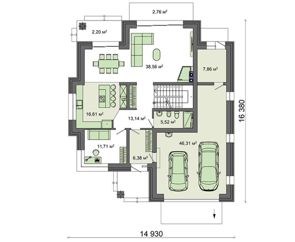 Предусмотренная на первом этаже спальня чаще используется для старшего поколения. Такое решение помогает им избежать передвижения по лестничным маршам. Помещение можно переоборудовать под кабинет для главы дома. Просторный гараж позволит хранить и обслуживать два автомобиля, установить стеллажи для запчастей и инструмента. Прилегающая котельная даст возможность организовать домашнюю мастерскую.