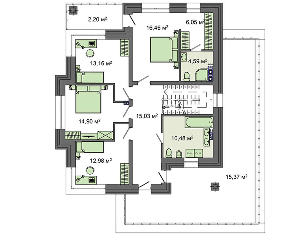 Второй этаж – это трехкомнатные апартаменты хозяина с балконом и три уютных спальни. На уровне находится санитарная комната с джакузи общего пользования и просторный холл, обеспечивающий выход на террасу. Здесь жильцы смогут принимать солнечные ванны, наслаждаться живописными пейзажами, устроить чаепитие на свежем воздухе.