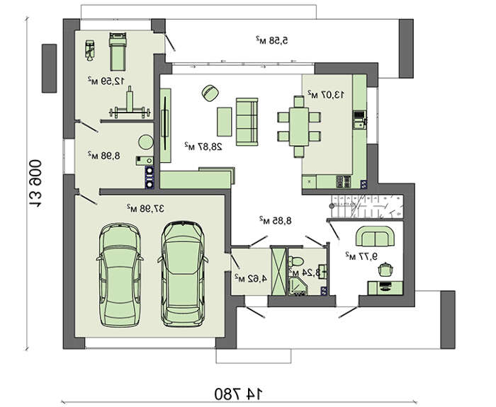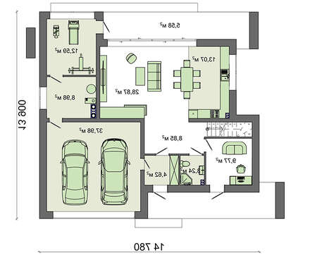 Жилая комната на нижнем уровне может быть использована в качестве кабинета или в качестве спальни для членов семьи старшего поколения. Значительную площадь в 38 кв. м занимает гараж для двух автомобилей. Места достаточно чтобы обслуживать транспорт и организовать небольшую кладовую для инструмента.
