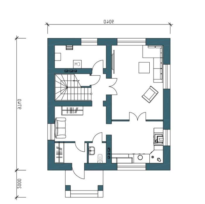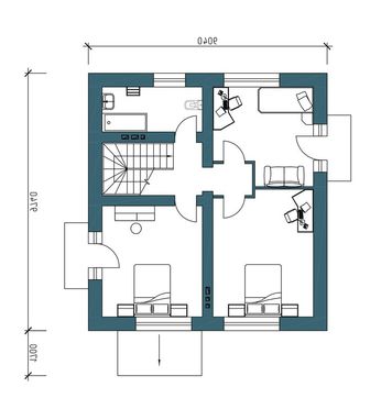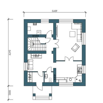 Планировка первого этажа очень понравится жильцам, которые предпочитают разделить зоны разного назначения и готовить пищу в отдельном помещении. Самая большая комната выделена под гостиную, из которой предусмотрено сразу два выхода: в коридор и кухню. В планировке определено место для топочной и гардеробной. Особая изюминка жилого дома – небольшая зона отдыха. Она объединяет все комнаты вместе. По габаритам рассчитана на установку мягкой мебели и журнального столика. Благодаря компактным размерам и удобному размещению в комнате создается особенно душевная атмосфера.