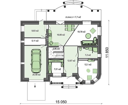 Пространство первого этажа поделено на просторные помещения разного назначения. В широком гараже свободно разместится одна единица транспорта, примыкающую комнату предполагается использовать для хранения инструмента и ведения работ по обслуживанию. Гостиная представлена тремя комнатами, в ее пространство включена столовая и кухня. Помещение имеет узкую вытянутую форму, которая зоны разного назначения удалила подальше друг от друга. Выход на крылечко поможет отдыхающим часть свободного времени проводить на свежем воздухе среди роскошных картин природы.
