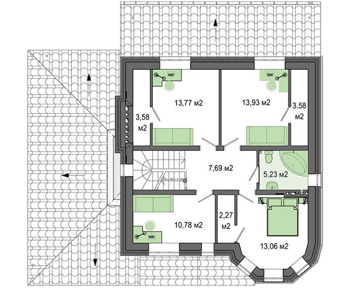 Пять спален способны разместить всех членов большой семьи. Комнаты расположены на разных этажах, но практически одинаковы по площади. Две спальни имеют уникальное расположение – зону эркера, она создает романтическое настроение и помогает поддерживать ощущение праздника. Почти в каждой комнате выделено место для гардероба.