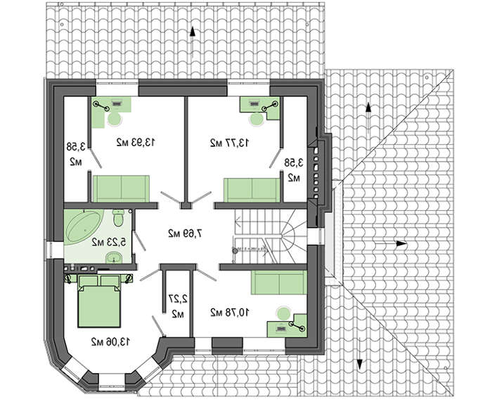 Пять спален способны разместить всех членов большой семьи. Комнаты расположены на разных этажах, но практически одинаковы по площади. Две спальни имеют уникальное расположение – зону эркера, она создает романтическое настроение и помогает поддерживать ощущение праздника. Почти в каждой комнате выделено место для гардероба.