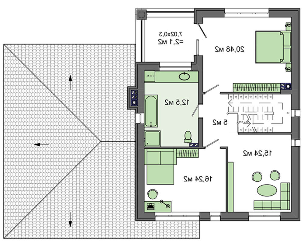 Огромные окна щедро впускают потоки солнечного света и создают праздничное настроение. Для того чтобы летом больше времени проводить на свежем воздухе предусмотрены терраса и балкон. Особая гордость первого этажа – роскошный гараж. На практике это два помещения, в каждое из которых легко помещается автомобиль представительного класса. Предусмотрена площадь для организации мастерской и хранения необходимого для сервиса инструмента.