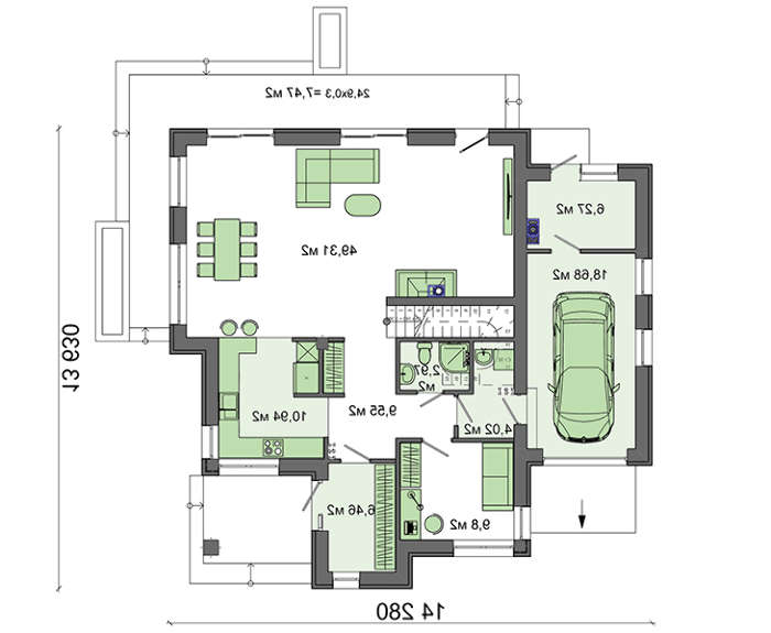 При планировании внутреннего пространства архитекторы постарались создать максимально комфортные условия. Встроенный гараж рассчитан на хранение одного автомобиля, имеется мастерская для размещения оборудования и инструмента, обслуживания транспорта. Небольшая спальня первого этажа чаще выбирается как личное помещение для старшего поколения.