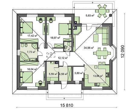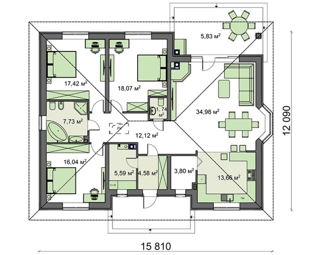 Проект одноэтажного дома с многоскатной кровлей, эркером и камином очень популярен. Традиционный архитектурный стиль и современный интерьер хорошо дополняют друг друга. В таком доме себя прекрасно будут чувствовать все члены большой семьи.