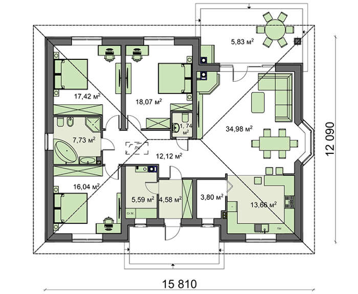 Все эти помещения образуют дневную часть дома. А есть еще и ночная, скрытая от посторонних глаз: три спальни, ванная комната, кладовая и комната для хозяйственных нужд