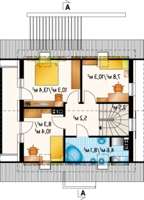 Отдыхать и расслабляться в доме принято на втором этаже. Для этого здесь три личные комнаты, небольшие размеры которых никоим образом не влияют на уровень благоустройства и комфорта. Выбравшие спальню с балконом будут особенно рады его простору и защищенности от атмосферных передряг.