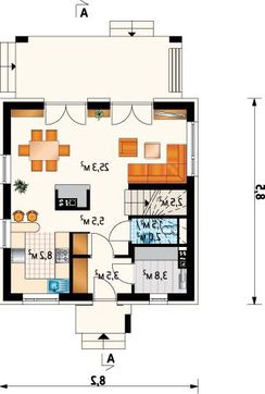 Для наполненной душевным комфортом встречи друзей и хороших приятелей все жилое пространство первого этажа соединено вместе и успешно справится с большими группами веселой молодежи, шумными детскими компаниями, понадобится для степенных разговоров представителей старшего поколения. Центр помещения — больший камин, который традиционно собирает довольно большие дружные компании и согревает тела и души присутствующих своим приветливым пламенем. Кухонной зоне выделено угловое достаточно отдаленное место, где выразительные сладковатые запахи пищи легко смогут собираться вместе.