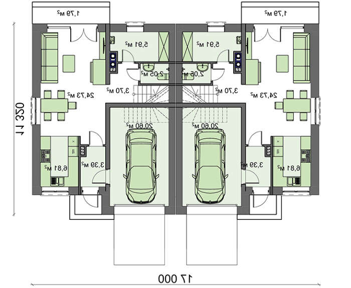 При проектировании дома для проживания двух семей большое внимание уделено внутренней планировке. Для оформления экстерьера использованы сочетания белого цвета с оттенками серого. Простые формы смотрятся стильно и современно. Дома соединены по части гаражей, что позволяет семьям вести практически независимый образ жизни, не мешать друг другу.