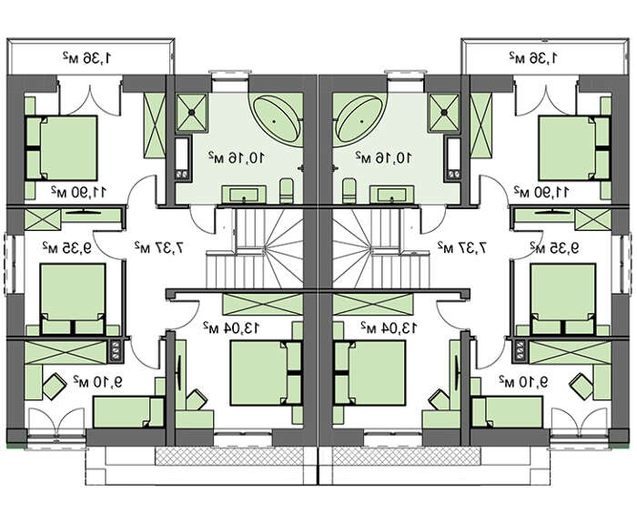 В проекте таунхауса предусмотрено четыре спальни. Все комнаты для сна находятся на втором этаже. Владельцы двух личных апартаментов получили преимущества за счет возможности проводить много времени в полузакрытом пространстве балкона. Его площадь рассчитана на размещение небольшого гарнитура для отдыха и утреннего чаепития.