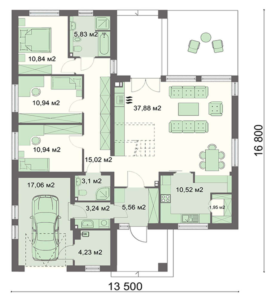 Особенностью жилого дома стал встроенный гараж. Небольшая площадь позволяет разместить одно транспортное средство. Предусмотрено место под мастерскую, где в тепле можно хранить оборудование и выполнять работы по обслуживанию.