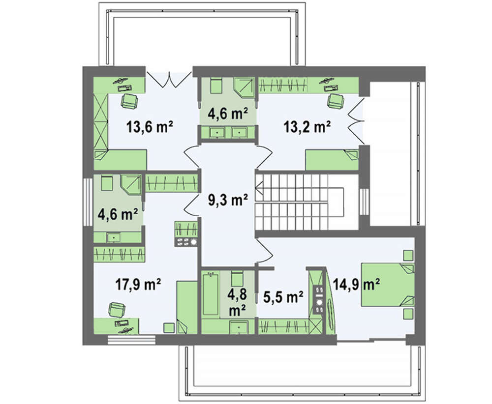 Отлично спроектированный второй этаж раскрывается компактными спальнями, которых здесь целых четыре. Одна краше другой. Трое из апартаментов имеют свой личный балкон, настраивающий на лирический лад и навивающих мечтательное настроение. Не бывает уюта без качественно решенных санитарных проблем, для реализации которых в каждой спальне имеется свой санузел.